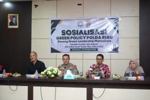Sosialisasi ini menghadirkan narasumber utama Kabidkum Polda Riau, Kombes Pol. M. Qori Oktohandoko, S.H., S.I.K., M.H., yang menyampaikan materi dengan gaya komunikatif dan inspiratif. Dalam paparannya, beliau menegaskan bahwa konsep green policy bukan hanya sebatas slogan, tetapi merupakan komitmen moral dan sosial yang harus diwujudkan dalam tindakan nyata.
