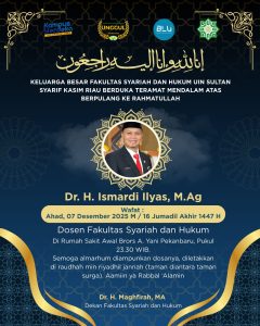 Pekanbaru-Civitas Akademika Fakultas Syariah dan Hukum (FSH) UIN Sultan Syarif Kasim Riau berduka mendalam atas wafatnya salah satu dosen terbaik dan sosok akademisi senior, Dr. Ismardi Ilyas, M.Ag. Almarhum berpulang ke Rahmatullah pada Minggu, 07 Desember 2025 pukul 23.30 WIB di Rumah Sakit Awal Bros Ahmad Yani, Pekanbaru.