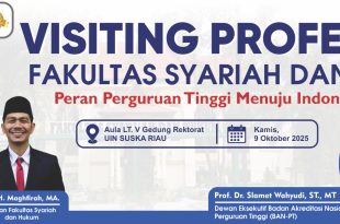 Pekanbaru — Fakultas Syariah dan Hukum (FSH) Universitas Islam Negeri Sultan Syarif Kasim (UIN Suska) Riau kembali menunjukkan komitmennya dalam memperkuat kualitas akademik dan visi kebangsaan melalui kegiatan Visiting Professor yang menghadirkan narasumber nasional, Prof. Dr. Slamet Wahyudi, ST., MT, selaku Dewan Eksekutif BAN-PT. Kegiatan yang mengusung tema “Peran Perguruan Tinggi Menuju Indonesia Emas 2045” ini …